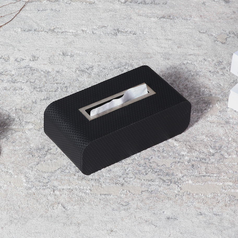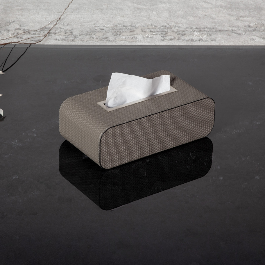 Round edged tissue boxMaterials: MDF, leatherLeather colors: white, black, milky white, light coffee, light gray, dark gray, egg yellow, gray blueSize: 230 * 120 * 77mmApplicable scenarios: KTV, bedroom, model room, hotel, office, store